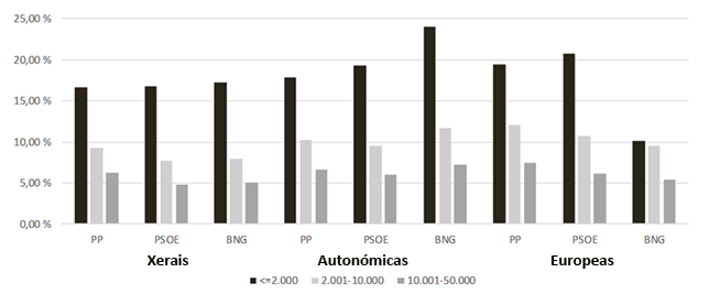 Os datos presentaranse só para o Partido Popular (PP), o Partido Socialista Obreiro Español (PSOE) e o Bloque Nacionalista Galego (BNG), por seren as únicas formacións políticas que tiveron unha presenza estable e significativa, en todo o período estudado, na política galega.