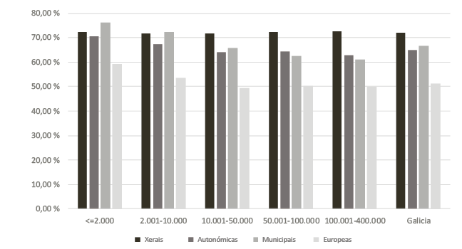 Para contrastar estas hipóteses, recórrese a unha metodoloxía na que, en primeiro lugar, se dividen os municipios tendo en conta a súa poboación e, en segundo lugar, se establecen dous grupos distinguindo aqueles nos que a alcaldía lle corresponde a unha formación política dos que non. Deste xeito, as diferenzas de voto entre estes dous grupos poden atribuírse ao feito de desempeñar a alcaldía, minimizando ao máximo a influencia do efecto composición, pois pártese da base de que as diferenzas entre municipios gobernados ou non por unha organización son mínimas nun hábitat dado. Para iso, analízanse os datos de todos os procesos electorais celebrados en Galicia a nivel estatal, autonómico e europeo, no período 2000-2020, agrupando os municipios en cinco categorías: ≤2.000 hab., 2.001-10.000 hab., 10.001-50.000 hab., 50.001-100.000 hab., e >100.000 hab. Os datos para as eleccións xerais, municipais e ao Parlamento Europeo proveñen da información subministrada polo Goberno de España a través da páxina web do Ministerio do Interior (MIR)15. Pola súa banda, os correspondentes ás eleccións autonómicas en Galicia obtivéronse da información facilitada para os diferentes procesos electorais pola Xunta de Galicia16. Os cálculos realízanse a partir do Censo de Residentes (CER), deixando fóra os datos do Censo de Residentes Ausentes (CERA), posto que os votos correspondentes a este se computan a nivel provincial, non podendo asignalos a ningún municipio.