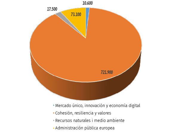 En total, si se suma a la dotación global de los Fondos Next Generation EU el marco financiero plurianual de la UE27 para el período 2021-27 (1,074 billones de euros), el importe global asciende a los 1,8 billones de euros, que se repartirán por objetivos, tal y como se resume en los gráficos 1 y 2. De este reparto se desprende que el objetivo de cohesión, resiliencia y valores es el más importante de todos los que se contemplan (426.700 y 776.500 millones de euros, a través del Marco Financiero Plurianual 2021-2027 y el Next Generation EU, respectivamente), con el mayor apoyo financiero destinado a la inversión orientada a la transformación digital y ecológica de los Estados.