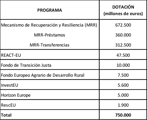 Ante la previsión de este círculo vicioso de consecuencias de la pandemia en la economía, el 21 de julio de 2020, el Consejo Europeo aprobó un plan para impulsar la convergencia, la resiliencia y la transformación en la UE, acordando un ambicioso paquete de medidas de gran alcance que se aúnan en torno a dos pilares: el marco financiero plurianual y la activación del Instrumento Europeo de Recuperación, Next Generation EU, con una dotación de 750.000 millones de euros.
