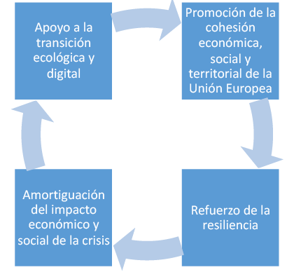 Este plan elaborado por la Comisión Europea tiene un doble objetivo: por un lado, relanzar la economía europea; por el otro, no hacerlo de cualquier forma, sino posibilitar que esta actuación favorezca la transición digital y ecológica, permitiendo un marco de desarrollo económico más justo, resistente y sostenible para las nuevas generaciones, todo esto en el marco de los Objetivos de Desarrollo Sostenible (ODS) de las Naciones Unidas. Este paquete de medidas tiene un conjunto de rasgos novedosos que los distingue de los fondos europeos tradicionales, al tratarse de recursos vinculados a hitos y objetivos, donde se identifican una serie de inversiones a realizar por la UE, concernientes a unas recomendaciones específicas y sin cofinanciación. En consecuencia, son un instrumento financiero diferente.