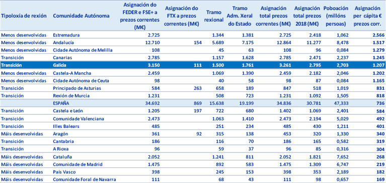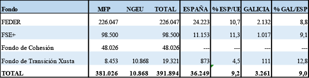 Galicia ten asignado un importe global de 3.261 millóns de euros a prezos correntes e, en termos absolutos, é tras Andalucía a comunidade autónoma que recibe máis fondos.