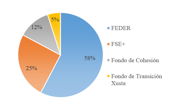 A política de cohesión desenvólvese a través do FEDER para investir no desenvolvemento social e económico de todas as rexións e cidades da UE; do Fondo de Cohesión (FC), para investir no medio ambiente e no transporte nos países menos prósperos da UE4; do Fondo Social Europeo Plus (FSE+) para apoiar o emprego e crear unha sociedade xusta e socialmente inclusiva; e do FTX para apoiar as rexións máis afectadas pola transición cara á neutralidade climática.