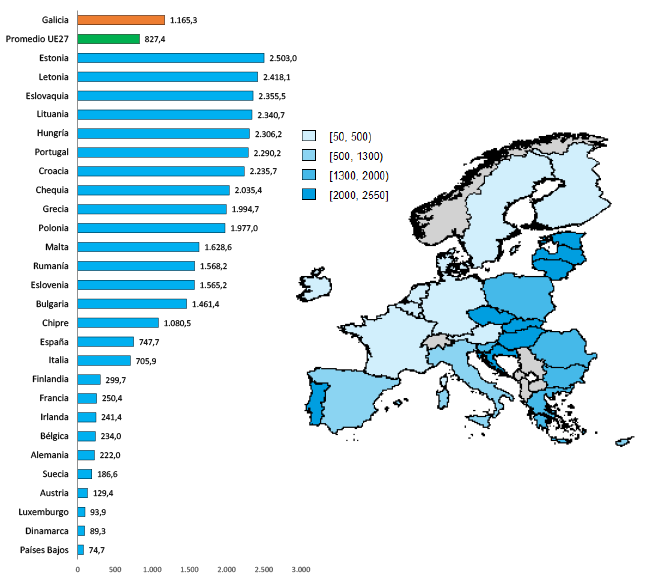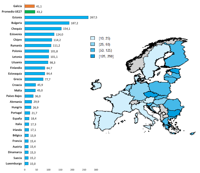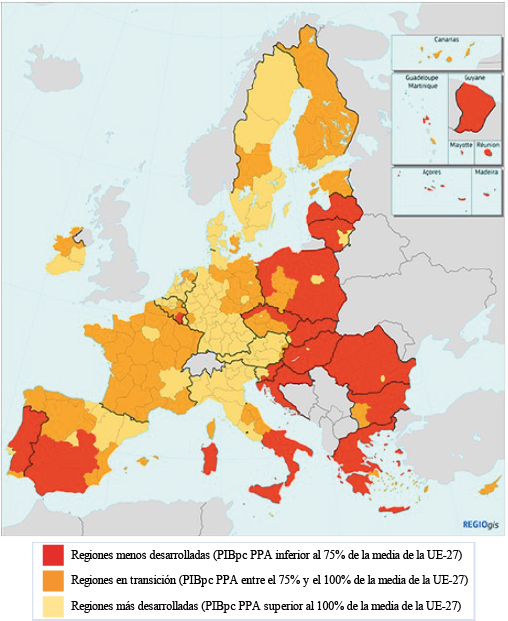 6 El PIBpc en PPA de Galicia es del 82 % de la media de la UE-27 en el período 2015-2017. En el período 2014-2020, Galicia estaba dentro de las regiones más desarrolladas, ya que su PIBpc en PPA en el período 2007-2009 superaba el 90 % de la media de la UE-27, porcentaje que diferenciaba las regiones en transición de las más desarrolladas.