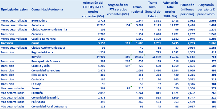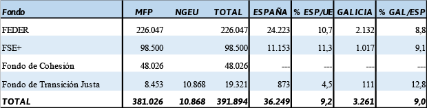 Galicia tiene asignado un importe global de 3.261 millones de euros a precios corrientes y, en términos absolutos, es tras Andalucía la comunidad autónoma que recibe más fondos.