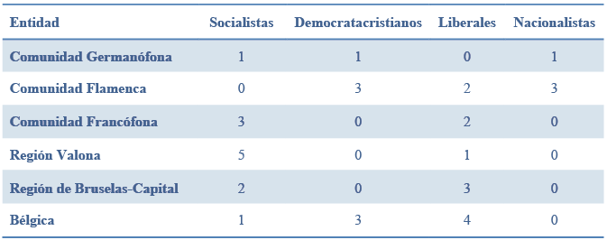 Esta pluralidad en la rotación de familias políticas al frente del ejecutivo es una característica en la que los sistemas políticos subnacionales se asemejan al nivel federal, que desde 1995 ha sido presidido en cuatro ocasiones por liberales, en tres por democratacristianos y en una por el socialista francófono Elio di Rupo. Sin embargo, es necesario señalar que la rotación a nivel regional y comunitario contrasta con la federal, puesto que tienen una mayor capacidad los líderes de los partidos socialista valón y neerlandés para conformar equipos ministeriales como constata que es la principal familia política en Valonia; la Comunidad Francesa ha tenido un peso importante en los ejecutivos de la Región de Bruselas-Capital y de la Comunidad Germanófona.
