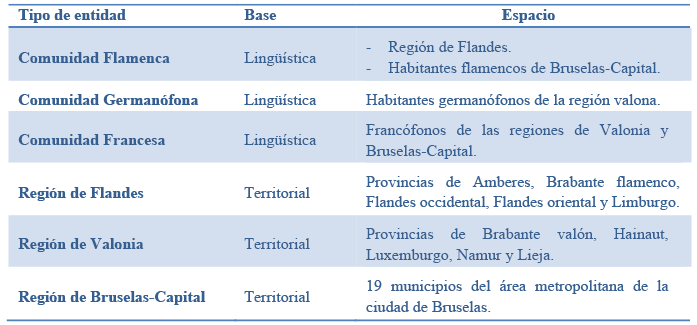 El modelo federal belga se basa en la existencia de una pluralidad de entidades federadas20. En este sentido, el artículo 1 de la Constitución belga (CB) señala que es un Estado federal que se compone de dos tipos de entidades: las regiones, de base territorial, y las comunidades, de base lingüística, mientras que los artículos 2 y 4 delimitan espacialmente el ámbito de cada entidad.