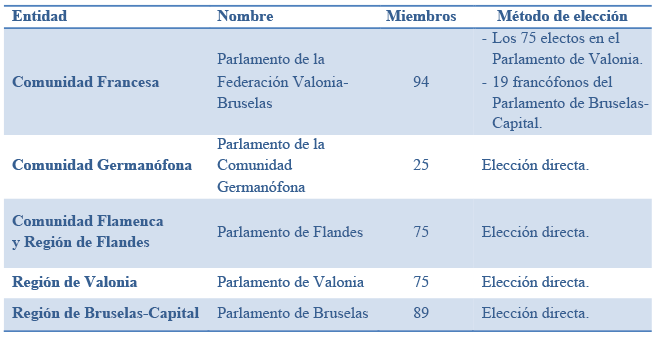 La cámara más reducida es el Parlamento de la Comunidad Germanófona (compuesto por 25 miembros), los legislativos de Valonia y Flandes cuentan con 75 escaños, mientras que el de Bruselas tiene 89 integrantes. En casi todos los casos los parlamentarios son elegidos mediante votación popular directa por parte de la comunidad política de la entidad federada.