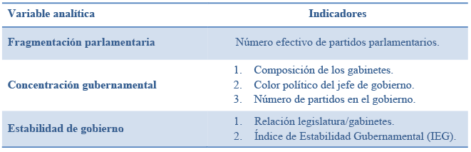 El análisis de la concentración gubernamental se determina mediante el estudio de tres indicadores que permiten apreciar el grado de fragmentación interna: en primer lugar, se examina la composición de los gabinetes en función de las familias políticas que los integran; en segundo término, se estudia el color político del jefe de gobierno; y, finalmente, se analiza el número de partidos que forman parte de cada gabinete.