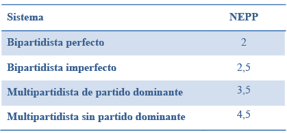 El NEPP muestra el sesgo que presenta el sistema de partidos que según Blondel26 puede tener carácter bipartidista (perfecto o imperfecto) o por el contrario tener naturaleza multipartidista (con o sin partido dominante en el sistema) en función del parámetro resultante de la aplicación de la fórmula.