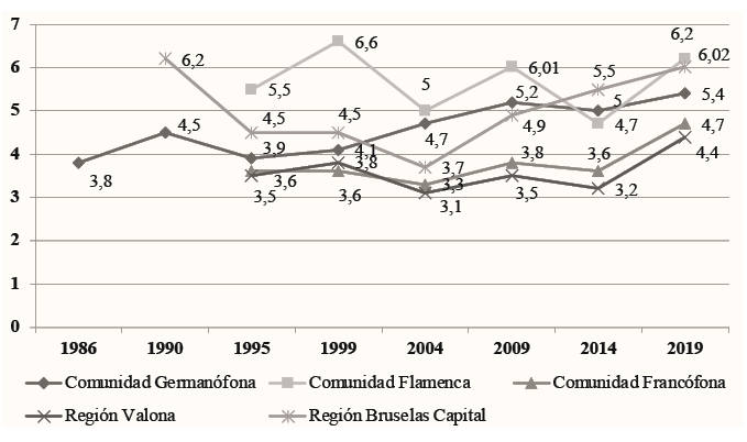 El primer elemento, por tanto, que se puede destacar de los sistemas políticos de las comunidades lingüísticas y de las regiones de Bélgica es su carácter fuertemente fragmentado, puesto que, como muestran los gráficos 1, 2 y 4, la pluralidad de actores políticos y de familias ideológicas constituye una seña de identidad del poder ejecutivo, como, sobre todo, del legislativo de cada una de las entidades federadas que han venido contando desde su constitución con parlamentos multipartidistas, así como con ejecutivos de coalición conformados por diversos partidos. Son especialmente relevantes los elevados niveles de fragmentación parlamentaria existentes en la Comunidad Flamenca, que se sitúan en un NEPP medio de 5,6 (llegando a alcanzar en 1999 el 6,6), así como en la Región de Bruselas-Capital, cuyo NEPP medio está en 5,04 (y que desde 2019 supera el 6).