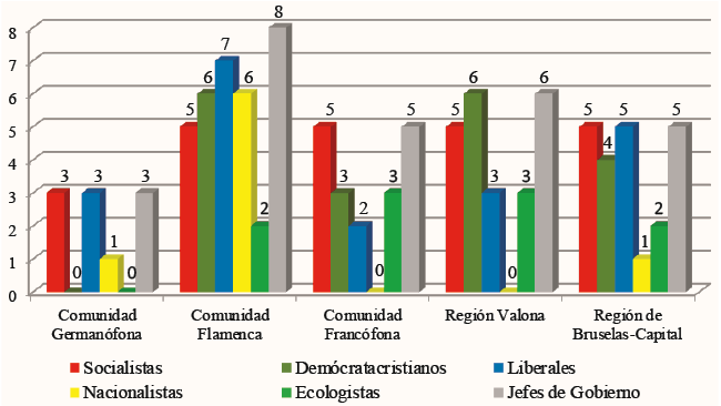 En las instituciones flamencas ha habido 8 primeros ministros; la familia política con mayor presencia en gabinetes son los liberales flamencos (Open VLD), que han estado en siete equipos gubernamentales; seguidos de democratacristianos (CD&V) y nacionalistas (Nueva Alianza Flamenca NV-A), con presencia en 6 ejecutivos, y los socialistas (Vooruit) lo han hecho en 5. Por su parte, la Comunidad Francófona ha tenido 5 jefes del ejecutivo, formando parte los socialistas (PS) de todos los gobiernos en los que ha habido una presencia importante de ecologistas (Ecolo) y de los democratacristianos (CDH).
