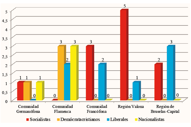 En este aspecto, el gráfico 3 permite observar que la mayoría de las entidades federadas han contado con primeros ministros pertenecientes a más de dos familias ideológicas, siendo especialmente significativos los casos de la Comunidad Germanófona, Francesa y Flamenca, que han tenido gobiernos presididos por hasta tres familias ideológicas. Solamente en los casos de Valonia y Bruselas la presidencia se ha alternado entre socialistas y liberales.