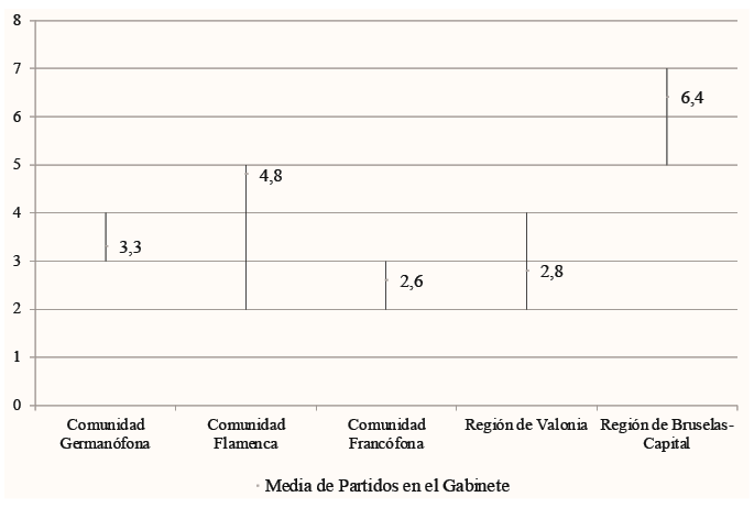 Esta fragmentación del poder ejecutivo es especialmente significativa en la Región de Bruselas-Capital, en cuyo Parlamento están representados el conjunto de familias ideológicas tanto neerlandesas como francófonas, y que ha contado en cada Gobierno con una media de 6,4 formaciones políticas. Además, también es apreciable en el caso del Ejecutivo flamenco, integrado de media por 4,8 partidos en cada equipo gubernamental.