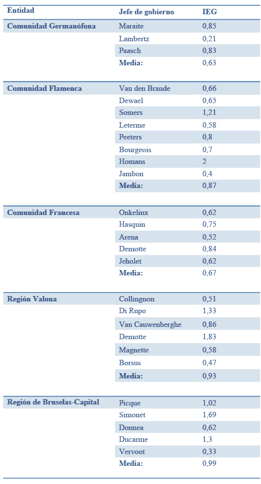 En cada uno de los mandatos de las asambleas legislativas de las comunidades y regiones se dan menores niveles de sustitución de equipos gubernamentales (el máximo es de 1,6 por legislatura en la Región Valona) y en todos los casos se acredita un IEG inferior a 1 en todas las entidades federadas de Bélgica.