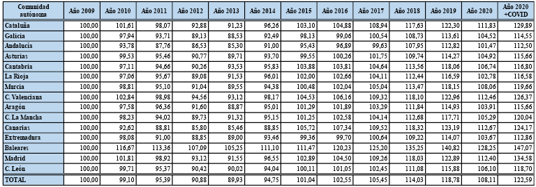 En el año 2020, el cuadro recoge también el índice de financiación homogénea per cápita añadiendo los recursos que las comunidades recibieron a través del Fondo COVID. Llama la atención la considerable bajada, en términos relativos, que experimentan algunas de las comunidades que, como Cantabria o Extremadura, se mantienen todos los años por encima de la media al introducir los datos del Fondo COVID. Igualmente, hay tres comunidades que incrementan claramente su posición relativa con el Fondo COVID, siendo las mismas que más incrementaban sus recursos: Baleares, Cataluña y Madrid.