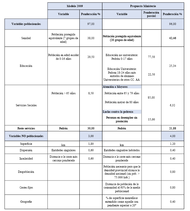 Analizando e interpretando la postura del ministerio en las diferentes alternativas que se proponen en el informe, podemos construir la propuesta que se recoge en la siguiente tabla, en la que también se establecen las variables y ponderaciones de la población ajustada en el actual modelo 2009.