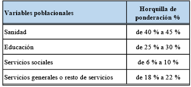 A los servicios generales les otorgan la variable que se utiliza en el modelo actual para el resto de los servicios: la población en función del padrón. El peso que el informe otorga al conjunto de las variables poblacionales es del 96 % y las horquillas para cada servicio se establecen en la tabla 4.
