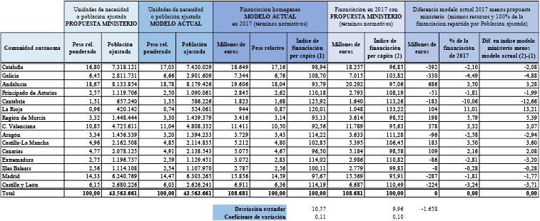 En el informe, el ministerio parece decantarse por una propuesta que modifica levemente la dispersión en las posiciones relativas de las comunidades autónomas en cuanto a sus recursos per cápita, pero que puede suponer una pérdida de recursos de unos 1.658 millones de euros para 9 comunidades autónomas.