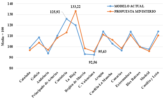 Una vez establecidas las variables y ponderaciones de lo que podría ser la propuesta central del ministerio, la tabla 5 presenta los principales resultados de la simulación planteada para el año 2017, que es del que se pueden obtener todos los datos necesarios. Dentro de esta tabla, optamos por comparar el índice de financiación per cápita del modelo actual con el de la posible propuesta del ministerio, ya que, al repartir en esta todos los recursos con arreglo a la población ajustada, la dispersión evidentemente desaparece.
