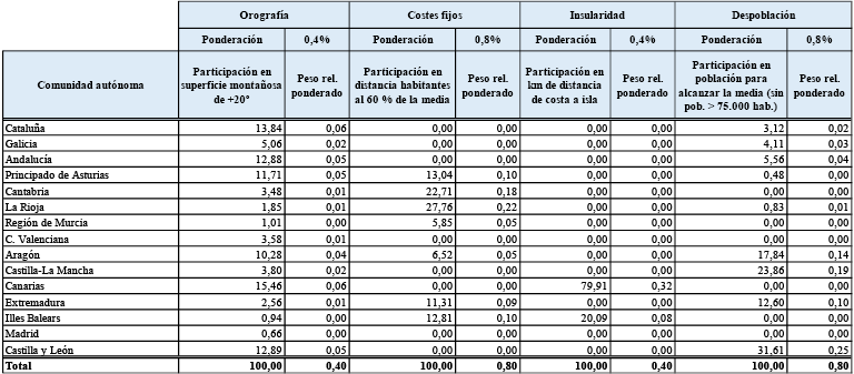 La tabla 6 recoge el detalle de la participación de cada comunidad autónoma en las anteriores variables, así como el reparto al que daría lugar la orografía, siendo Canarias la que más se llevaría por esta variable, seguida de Cataluña, Castilla y León y Andalucía. En el lado opuesto, las menos beneficiadas serían Madrid, Baleares y Murcia.