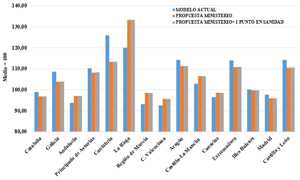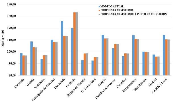 Hay que destacar que existen cuatro regiones que coinciden en la recepción de fondos derivados de los criterios de despoblación y costes fijos: Asturias, La Rioja, Aragón y Extremadura, aunque de todas ellas solo La Rioja consigue ganar recursos con la propuesta conjunta del ministerio, las otras tres pierden suficiencia con respecto a la situación actual.