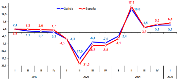 Gráfico 1. Evolución del PIB de Galicia y España. 2019-2022