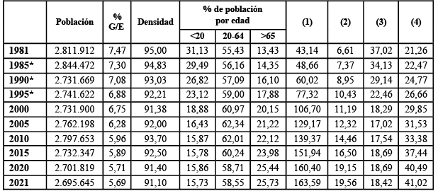Notas: (1) Tasa de envejecimiento: mide el cociente entre las personas de 65 y más años respecto a los menores de 15 años; (2) Tasa de sobreenvejecimiento: porcentaje de población de 85 años y más respecto a la población de 65 años y más; (3) Tasa de dependencia juvenil: proporción de la población menor de 15 años respecto a la población activa de entre 15-64 años; (4) Tasa de dependencia senil: proporción existente entre la población mayor de 64 años y la población de entre 15-64 años. (*) Los datos de 1980 corresponden a 1981; los de 1985, al año 1986; y los de 1990, al año 1991.