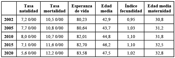 O sea, Galicia refleja un proceso de envejecimiento muy notable que hace que la esperanza de vida sea muy alta (más de 83 años) y que los índices de envejecimiento (población de más de 65 años con respecto a cada 100 personas menores de 20 años) alcancen una ratio del 163,6 %, que el índice de sobreenvejecimiento (población de más de 85 años con respecto a la población mayor de 65 años) sea del 19,5 % y que el índice de dependencia senil (individuos de más de 65 años por cada 100 habitantes potencialmente activos de entre 15-64 años) pase del 21 % en 1981 al 41 % en 2021.