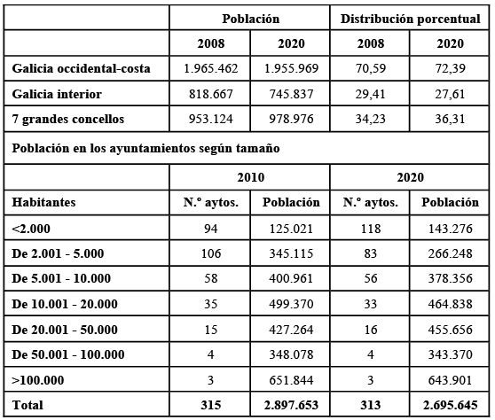 Es decir, Galicia se incorpora a la tendencia de las regiones y países más desarrollados en los que la población se concentra en las áreas urbanas ampliadas, subrayando, en consecuencia, un intenso proceso de urbanización (65,9 % en 1986 y 70,5 % en 2005, que supone un incremento del 4,51 %), aunque menos intenso que el registrado en España y en Europa (76,7 % y 76,2 % para 2005, respectivamente). Dichos desplazamientos de la población se asocian con índices de despoblación rural más intensos y con aumentos muy notables de los fenómenos de periurbanización. En el caso de Galicia, se produce con un importante retraso temporal, pues hay que recordar que el porcentaje de población urbana de España en 1950 ya era del 65,4 % y del 77,3 % en 1970. Y, en lo que se refiere a la concentración de la población, se dan dos fenómenos: a) la población asentada en municipios mayores de 10.000 habitantes aumenta del 67 % al 70,5 % en el periodo 2008-2020; y b) la población concentrada en las siete grandes ciudades pasa del 34,5 % en 2008 al 36,5 % en 2020.