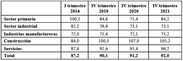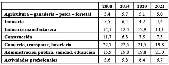 Analizando la evolución del peso de las remuneraciones de los asalariados por sectores, se observa que: a) el peso que desempeña el sector primario es muy bajo, por mor de su reducido número de asalariados, b) el porcentaje que representan los asalariados de las actividades industriales se reduce a lo largo de todo el periodo, hasta situarse en 2021 por debajo del 20 %, c) los asalariados de la construcción sufren una fuerte disminución a partir de la recesión de 2008 y se no han recuperado de dicho descenso, y d) solo los asalariados del sector servicios mantienen una senda ascendente.