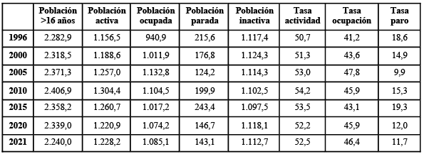 La población activa creció hasta el año 2009. A partir de dicha fecha comienza un descenso prolongado que se manifiesta en la caída de la tasa de actividad (54,8 % en 2009 y 52,5 % en 2021). El número de ocupados decrece desde la recesión de 2008 y no recupera el nivel hasta el año 2014. La pandemia también afecta a los ocupados, hasta el punto de que la tasa de ocupación registra una tasa del 46,9 % en 2019, un 45,9 % en 2020 y un 46,4 % en 2021. Por el contrario, la población parada contabiliza un fuerte incremento desde el año 2007 (97.800 personas) hasta el año 2013 (284.000 personas), para luego ir descendiendo hasta llegar al año 2021 con un total de 143.100 personas, equivalentes a una tasa de paro del 11,7 %, cuando había llegado a alcanzar el 22 % en 2013.