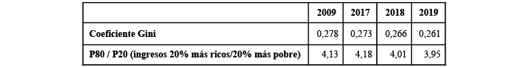 La desigualdad puede ser medida por medio de varias técnicas e indicadores. En primer lugar, la desigualdad la podemos medir a través del coeficiente de Gini. Este índice oscila entre 0 y 1, donde 0 se corresponde con una perfecta igualdad (todos tienen los mismos ingresos) y el valor 1 expresa la perfecta desigualdad. A lo largo del periodo 2009-2019 el valor del coeficiente de Gini desciende levemente (0,278 y 0,261) y se reduce en mayor proporción que el índice español (0,330). Es decir, una leve disminución que expresa una mínima corrección de las desigualdades. Si nos atenemos al análisis provincial, A Coruña es el territorio con mayor nivel de desigualdad, con índices superiores a la media gallega, y en Lugo es donde hay más igualdad.