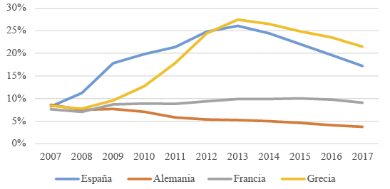 Como se pode comprobar, España foi, xunto con Grecia, o país da eurozona que máis incrementou a súa taxa de desemprego durante a recente crise económica, mentres que, por exemplo, en Francia e Alemaña o aumento foi máis contido. Só a partir de 2013 (a taxa de paro en España chegou ao 26,3% en febreiro dese ano) comeza a notarse a melloría no mercado de traballo en España; aínda así, a taxa de desemprego no noso país cuadriplica a de Alemaña e case duplica a de Francia en 2017.
