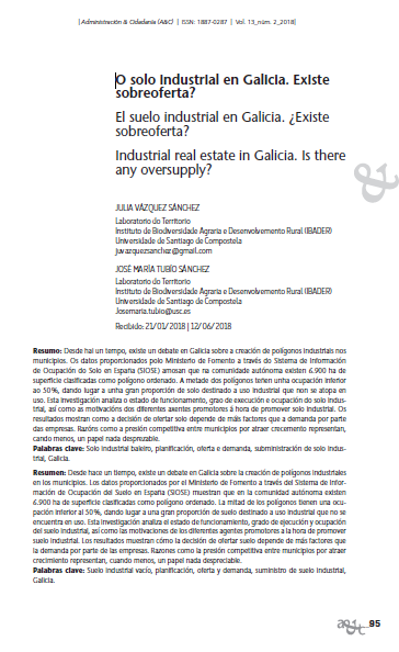 Desde hai un tempo, existe un debate en Galicia sobre a creación de polígonos industriais nos municipios. Os datos proporcionados polo Ministerio de Fomento a través do Sistema de Información de Ocupación do Solo en España (SIOSE) amosan que na comunidade autónoma existen 6.900 ha de superficie clasificadas como polígono ordenado. A metade dos polígonos teñen unha ocupación inferior ao 50 %, dando lugar a unha gran proporción de solo destinado a uso industrial que non se atopa en uso. Esta investigación analiza o estado de funcionamento, grao de execución e ocupación do solo industrial, así como as motivacións dos diferentes axentes promotores á hora de promover solo industrial.