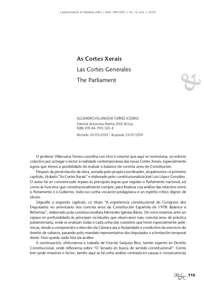 O profesor Villanueva Turnes coordina con tino o volume que aquí se recensiona, un esforzo colectivo por achegar o lector á realidade contemporánea das nosas Cortes Xerais, especialmente agora que temos a posibilidade de realizar o balance de corenta anos de Constitución.