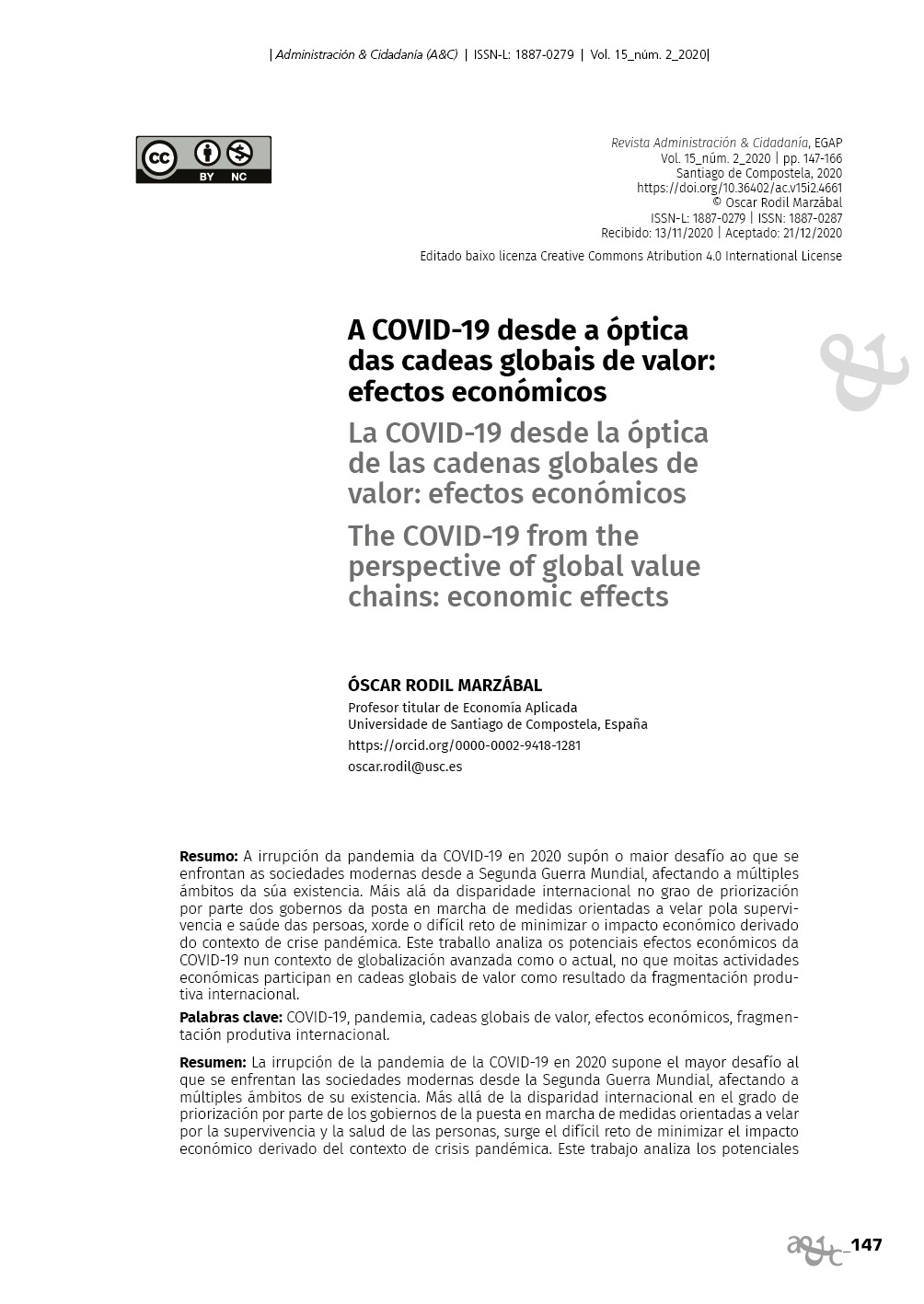 A irrupción da pandemia da COVID-19 en 2020 supón o maior desafío ao que se enfrontan as sociedades modernas dende a Segunda Guerra Mundial, afectando a múltiples ámbitos da súa existencia. Máis alá da disparidade internacional no grao de priorización por parte dos gobernos da posta en marcha de medidas orientadas a velar pola supervivencia e saúde das persoas, xorde o difícil reto de minimizar o impacto económico derivado do contexto de crise pandémica. Este traballo analiza os efectos e implicacións derivadas da COVID-19 nun contexto de globalización avanzada como o actual, no que moitas actividades económicas participan en cadeas globais de valor, como resultado da fragmentación produtiva internacional.