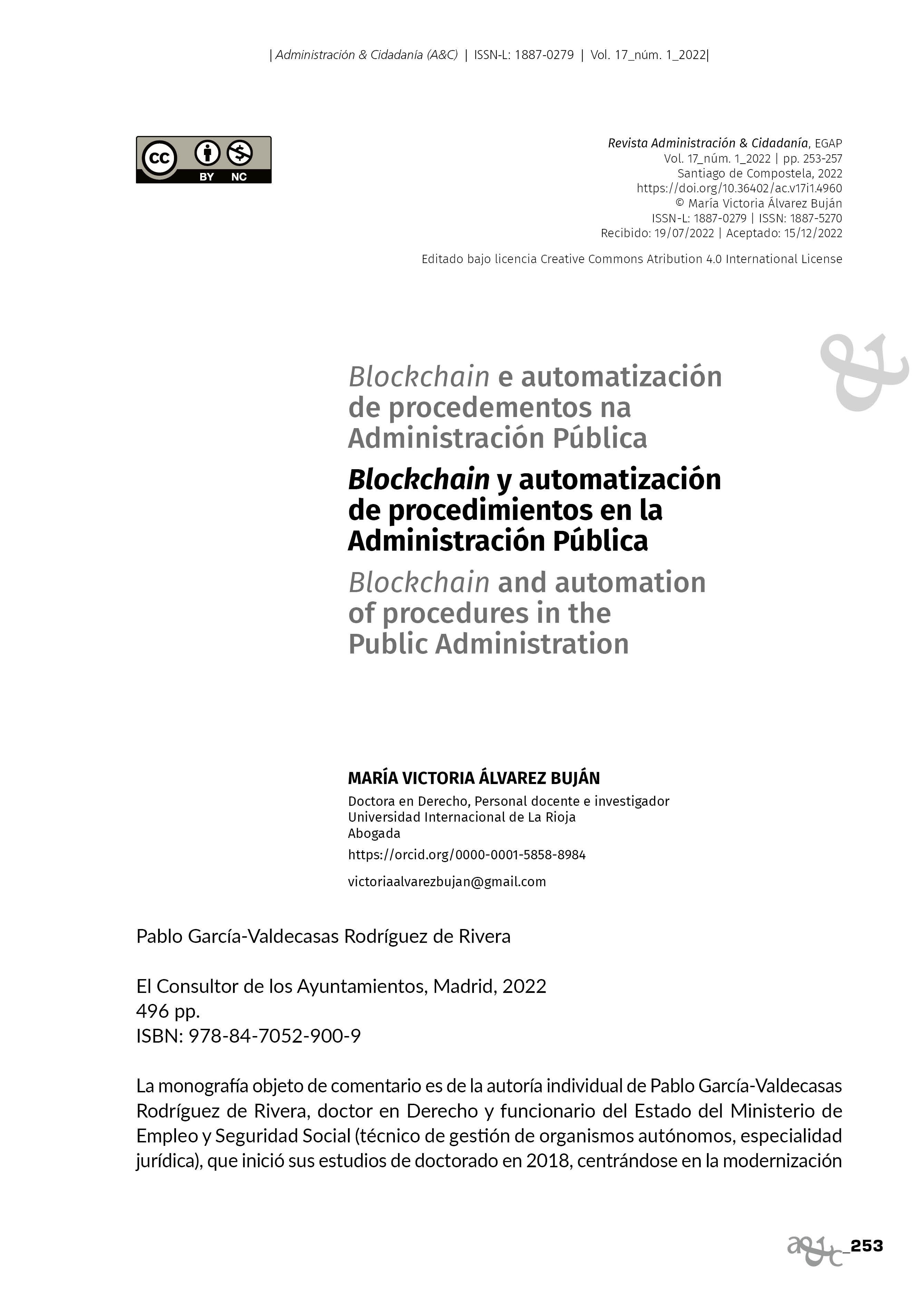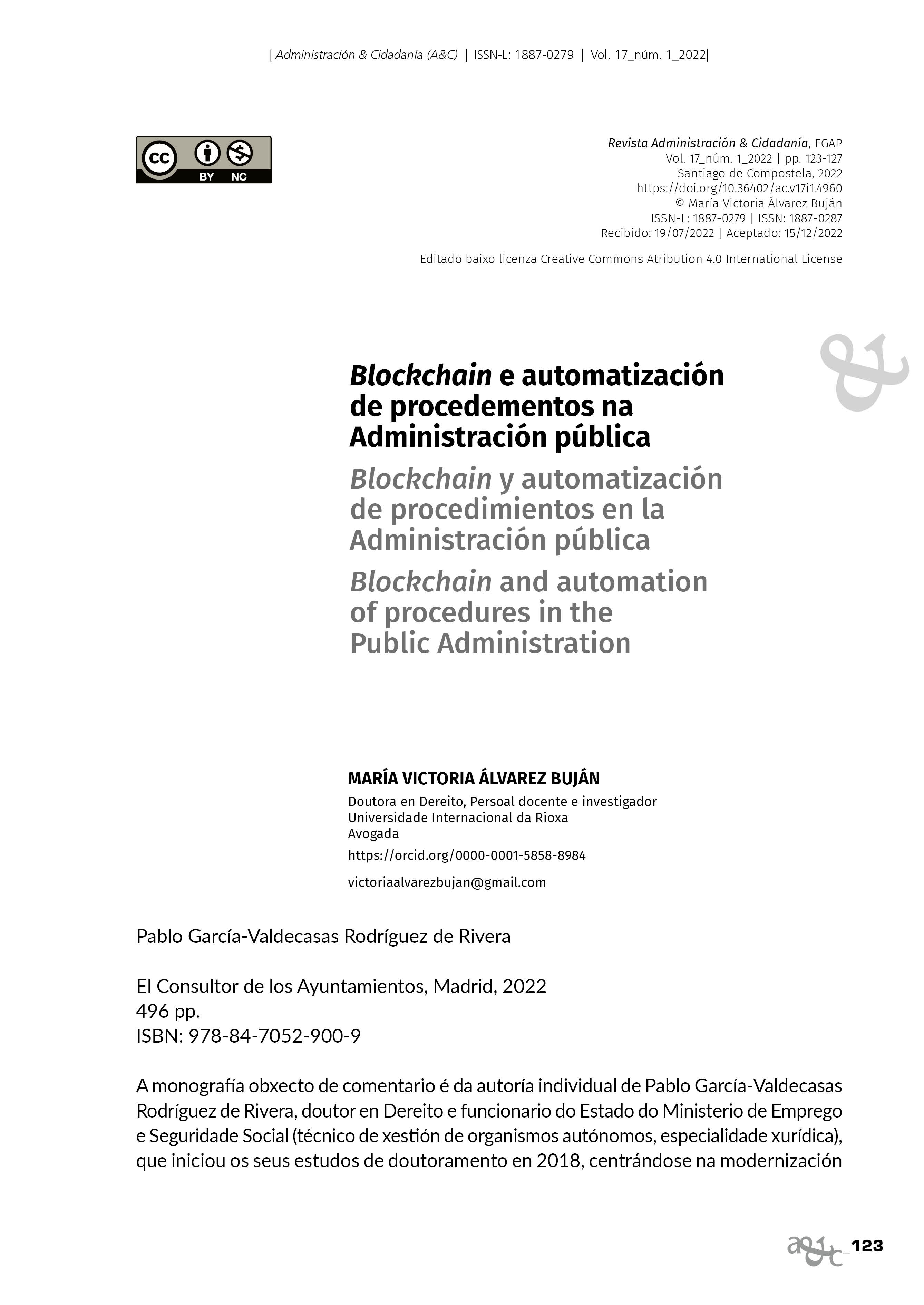 Recensión de GARCÍA-VALDECASAS RODRÍGUEZ DE LA RIVERA, Pablo (2022): Blockchain y automatización de procedimientos en la Administración pública. El Consultor de los Ayuntamientos (Madrid), 496 páxinas.