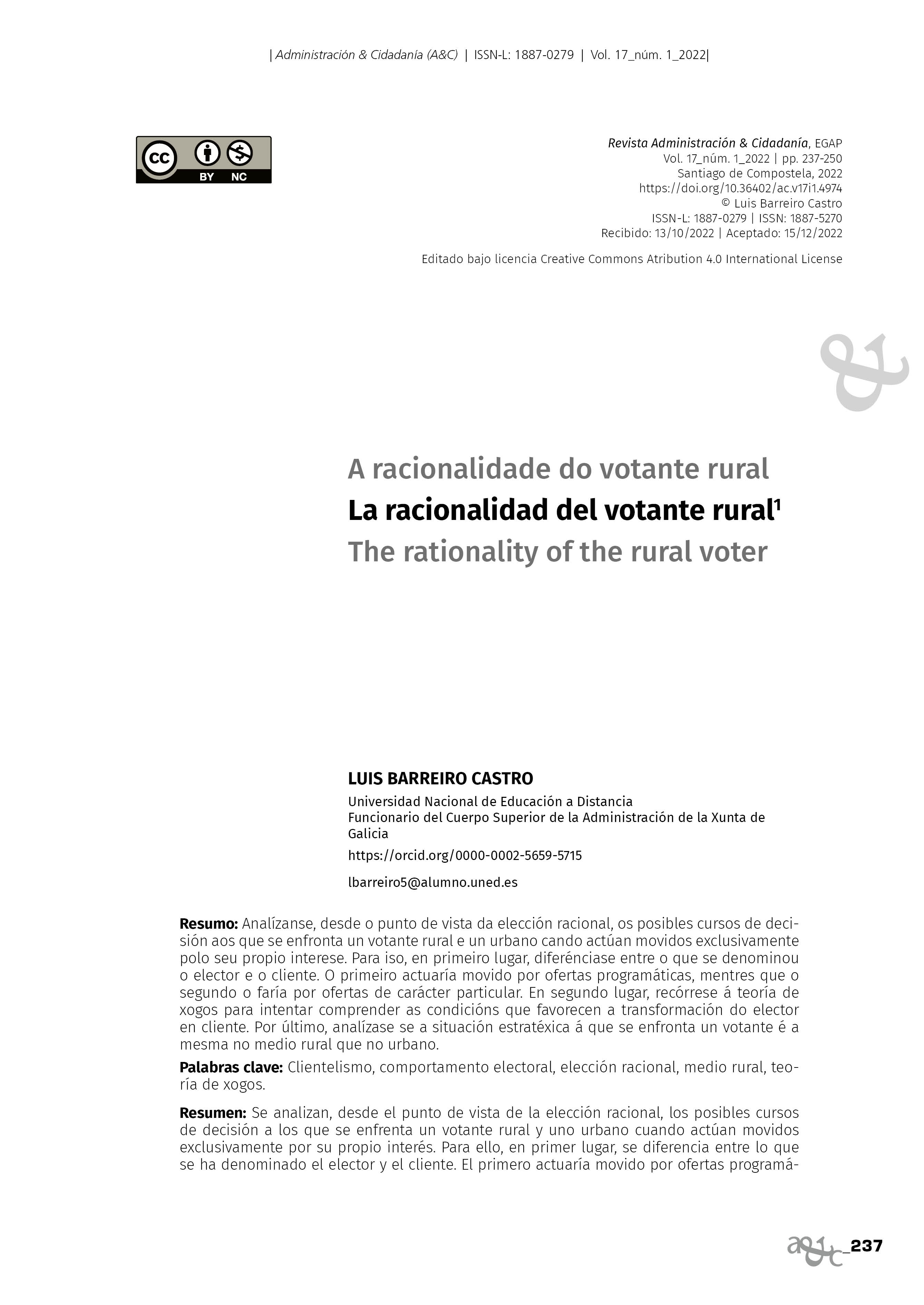 Analízanse, desde o punto de vista da elección racional, os posibles cursos de decisión aos que se enfronta un votante rural e un urbano cando actúan movidos exclusivamente polo seu propio interese. Para iso, en primeiro lugar, diferénciase entre o que se denominou o elector e o cliente. O primeiro actuaría movido por ofertas programáticas, mentres que o segundo o faría por ofertas de carácter particular. En segundo lugar, recórrese á teoría de xogos para intentar comprender as condicións que favorecen a transformación do elector en cliente. Por último, analízase se a situación estratéxica á que se enfronta un votante é a mesma no medio rural que no urbano.