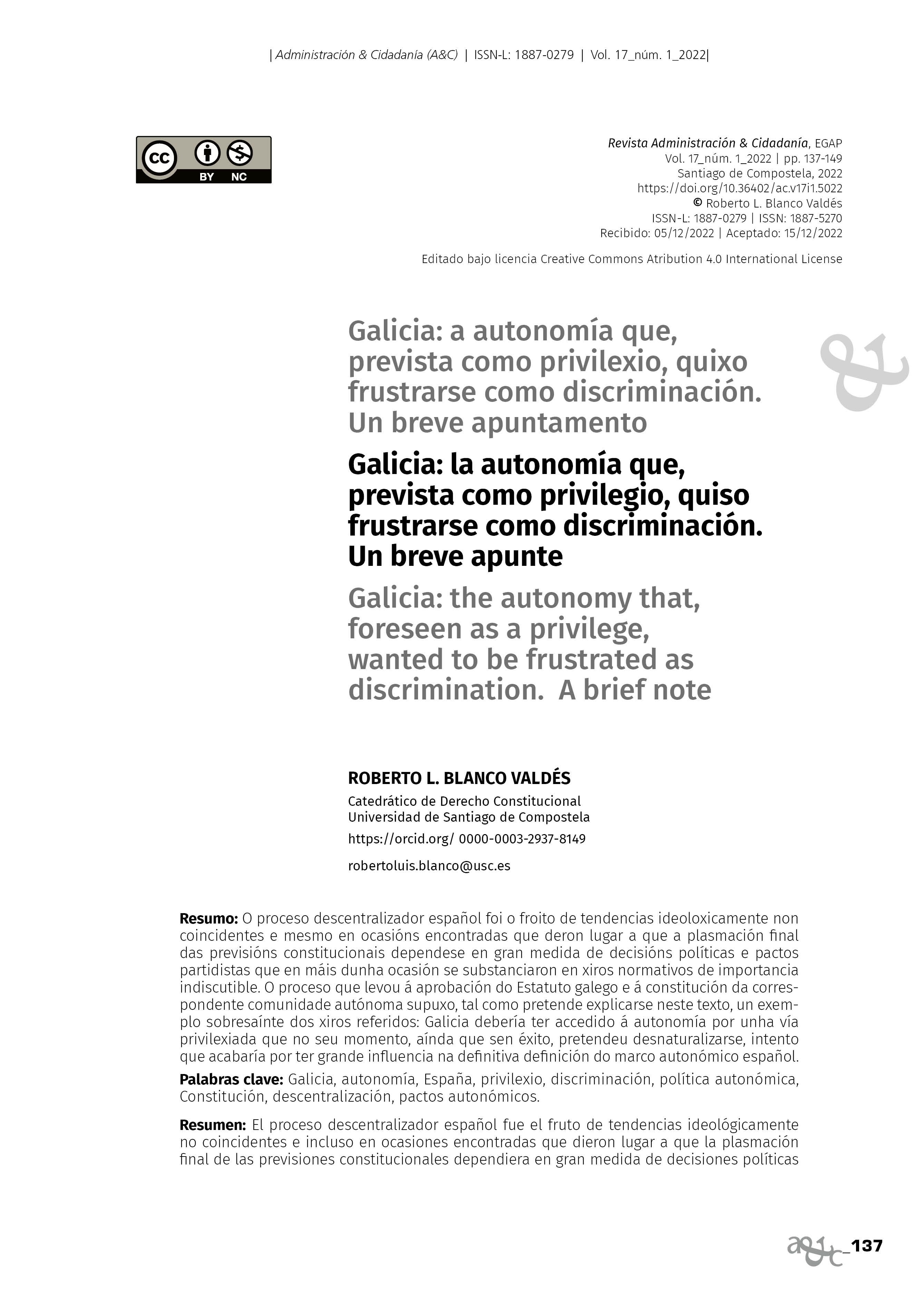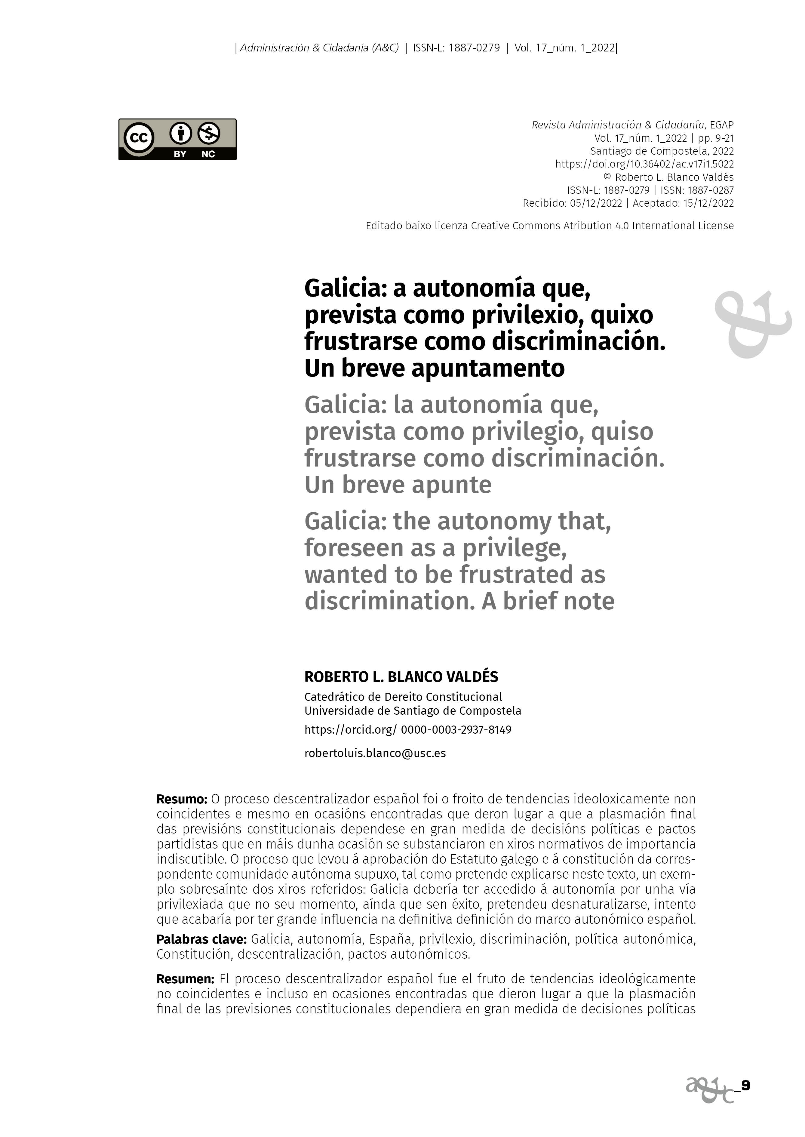 O proceso descentralizador español foi o froito de tendencias ideoloxicamente non coincidentes e mesmo en ocasións encontradas que deron lugar a que a plasmación final das previsións constitucionais dependese en gran medida de decisións políticas e pactos partidistas que en máis dunha ocasión se substanciaron en xiros normativos de importancia indiscutible. O proceso que levou á aprobación do Estatuto galego e á constitución da correspondente comunidade autónoma supuxo, tal como pretende explicarse neste texto, un exemplo sobresaínte dos xiros referidos: Galicia debería ter accedido á autonomía por unha vía privilexiada que no seu momento, aínda que sen éxito, pretendeu desnaturalizarse....