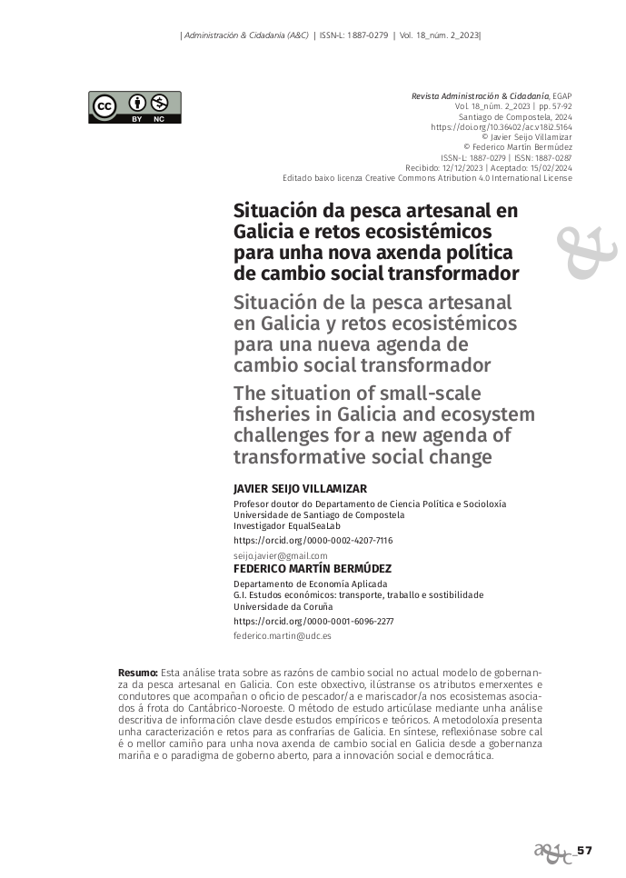 This analysis deals with the reasons for social change in the current governance model of artisanal fishing in Galicia. With this aim, it illustrates the emerging and driving attributes that accompany the profession of fishermen and shellfish gatherers in the ecosystems associated with the Northwest Cantabrian fleet. The study method is articulated through a descriptive analysis of key information from empirical and theoretical studies. The methodology presents a characterisation and challenges for the Galician fishermen’s associations. In summary, it reflects on the best way forward for a new agenda of social change in Galicia from the marine governance and open government paradigm, for social and democratic innovation.
