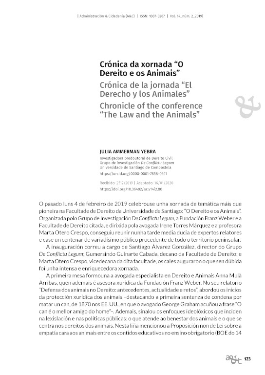 A Facultade de Dereito da Universidade de Santiago de Compostela acolleu durante a tarde do luns 4 de febreiro de 2019 a Xornada "O Dereito e os Animais". Nela debatíronse temas como o vínculo existente entre o maltrato animal e a violencia interpersoal, a reforma do Código civil relativa ó rexime xurídico dos animais, ou a lei galega sobre protección e benestar dos animais de compañía en Galicia.