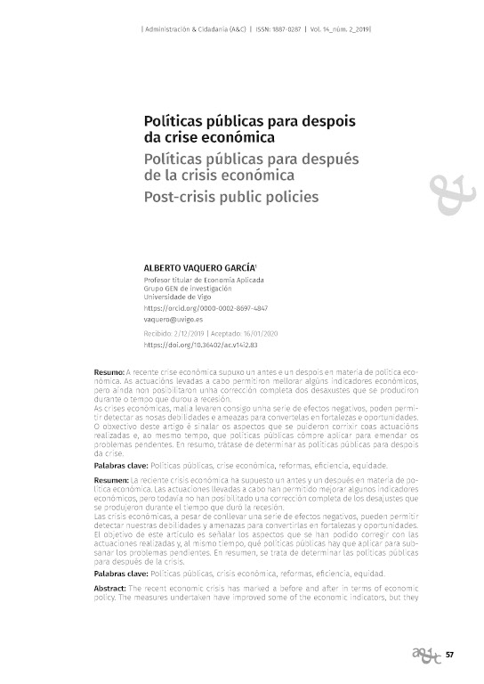 A recente crise económica supuxo un antes e un despois en materia de política económica. As actuacións levadas a cabo permitiron mellorar algúns indicadores económicos, pero aínda non posibilitaron unha corrección completa dos desaxustes que se produciron durante o tempo que durou a recesión. As crises económicas, malia levaren consigo unha serie de efectos negativos, poden permitir detectar as nosas debilidades e ameazas para convertelas en fortalezas e oportunidades. O obxectivo deste artigo é sinalar os aspectos que se puideron corrixir coas actuacións realizadas e, ao mesmo tempo, que políticas públicas cómpre aplicar para emendar os problemas pendentes. En resumo, trátase de determinar as políticas públicas para despois da crise.