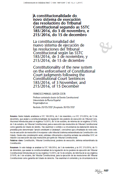 A constitucionalidade do novo sistema de execución das resolucións do Tribunal Constitucional segundo as SSTC 185/2016, do 3 de novembro, e 215/2016, do 15 de decembro
