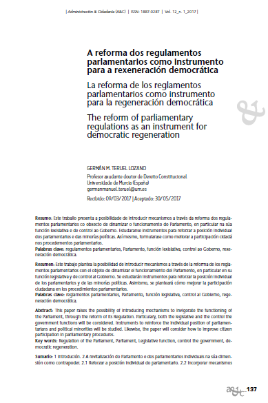 A reforma dos regulamentos parlamentarios como instrumento para a rexeneración democrática