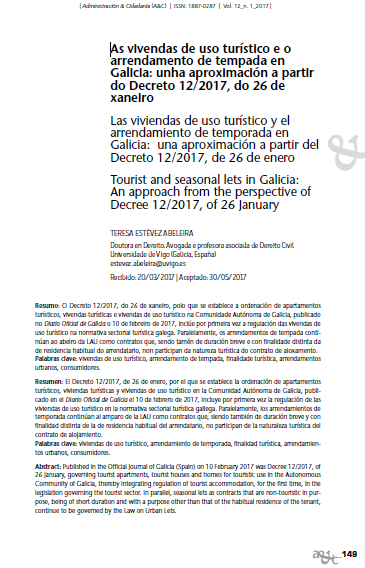 As vivendas de uso turístico e o arrendamento de tempada en Galicia: unha aproximación a partir do Decreto 12/2017, do 26 de xaneiro