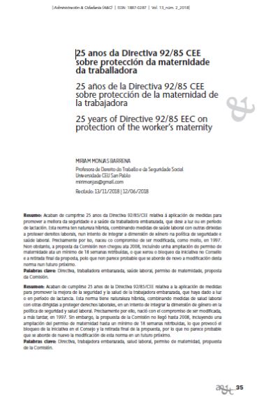 25 anos da Directiva 92/85 CEE sobre protección da maternidade da traballadora