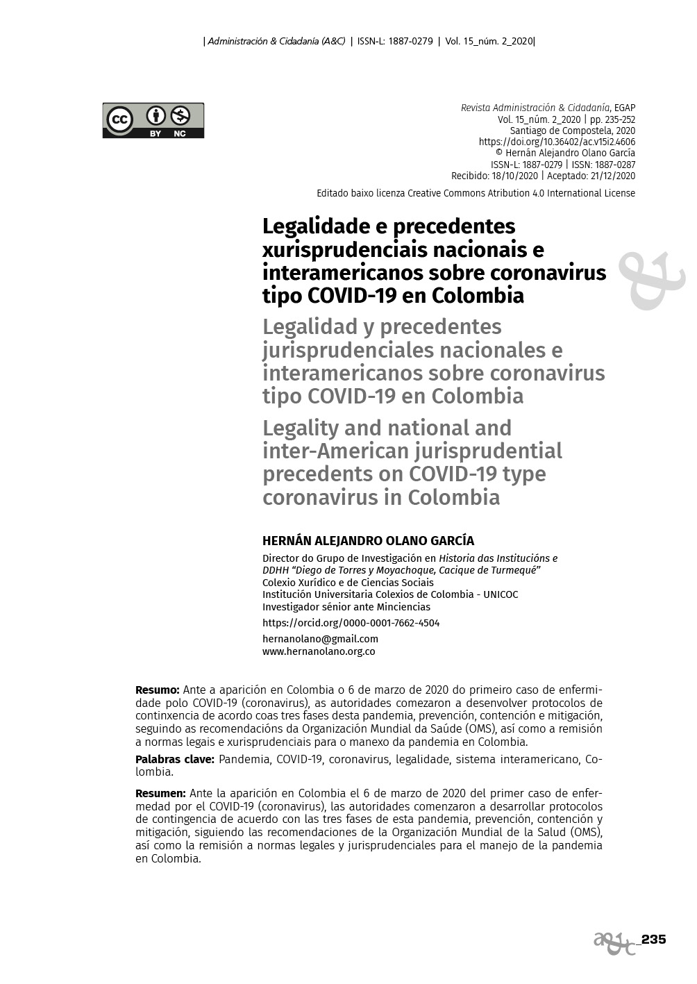 Legalidade e precedentes xurisprudenciais nacionais e interamericanos sobre coronavirus tipo COVID-19 en Colombia