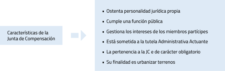 En este sentido, la JC presenta unas particularidades propias, pues se constituye como una entidad urbanística colaboradora con personalidad jurídica propia y con capacidad plena en la toma de decisiones que considere pertinentes, teniendo como objetivo principal controlar y dirigir el proceso de urbanización, que agrupa a todos los agentes que participan en este sistema, y no persiguiendo en ningún caso fines lucrativos. Además, gestionan intereses estrictamente privados de sus miembros, pero que están sometidos a la tutela de una Administración pública, la cual le otorga el ejercicio de una serie de potestades administrativas para la consecución de sus actividades en la medida necesaria para garantizar los intereses públicos, mostrando el gráfico 1 las principales características de la JC.