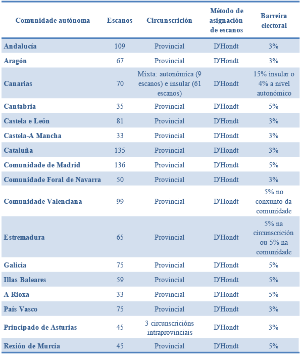 Polo tanto, o desenvolvemento institucional autonómico levou consigo a creación de 17 parlamentos nos que hai unha composición dispar que oscila entre os 33 escanos do Parlamento da Rioxa e os 136 da Asemblea de Madrid. Na totalidade das asembleas lexislativas os escanos asígnanse mediante o emprego do sistema D’Hondt e na maioría utilízase a provincia ou a illa como circunscrición electoral (agás Asturias, que divide a provincia en 3 distritos electorais, e Canarias, que creou en 2018 unha circunscrición autonómica) e a definición dunha barreira electoral case sempre baseada na circunscrición provincial (coas excepcións de Canarias, Comunidade Valenciana e Estremadura, que a elevan nalgúns casos a comunidade autónoma) con porcentaxes que oscilan entre o 3 % e o 5 %.